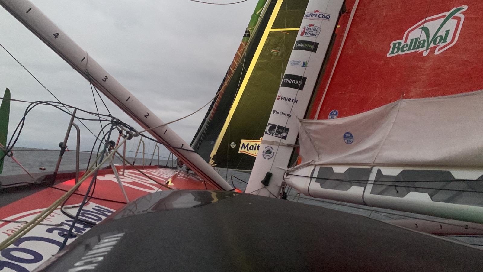 Une brise de secteur Est s’est levée sur le golfe de Gascogne et permet de gonfler les voiles de Maître CoQ IV et de ses concurrents. Yannick et Jean-Marie filent à plus de 12 nœuds vers le Cap Finisterre en 9e position.