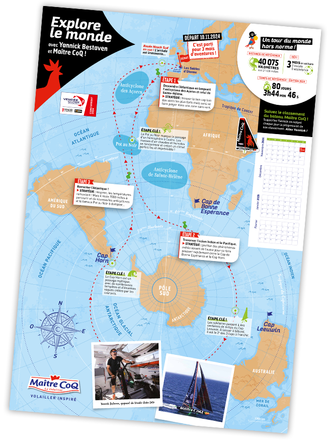Le kit pédagogique Vendée Globe conçu par Maître CoQ pour vivre la course de son skipper Yannick Bestaven. Dans ce kit, se trouve une grande carte pour suivre l’évolution du bateau autour du monde avec des stickers repositionnables du bateau.