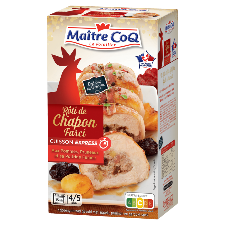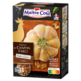 – préparé avec un chapon désossé, farci, puis ficelé à la main#- déjà cuit dans notre atelier pour une cuisson express chez vous.