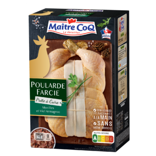 – préparée à partir d’une poularde semi-désossée, farcie, puis ficelée à la main et facile à découper.