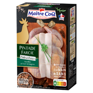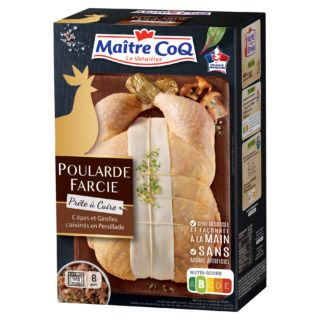 – préparée à partir d’une poularde semi-désossée, farcie, puis ficelée à la main et facile à découper.