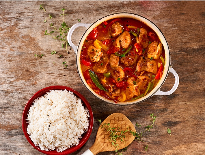 La dinde basquaise se mariera parfaitement à du riz parfumé, des pates, de la semoule mais également à des légumes de saison.