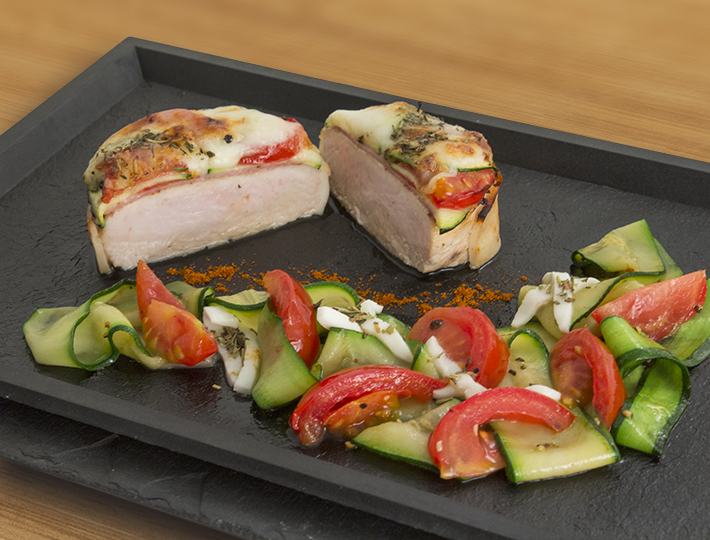 - Dans un plat, placez les tournedos de filet de dinde, le bacon et alternez les lamelles de courgette, rondelles de tomate. Puis déposez les tranches de mozzarella.