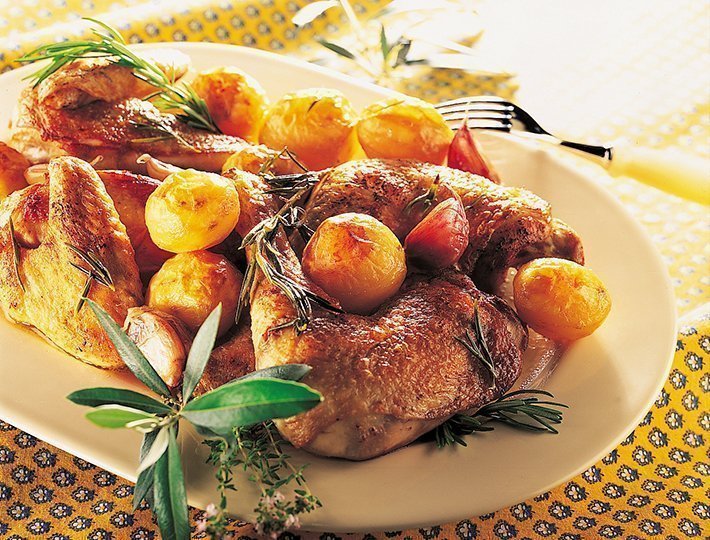 - Mettre dans un plat en fonte les morceaux de poulet badigeonnés d’huile, les pommes de terre autour. Mouillez avec les 4 cuillères à soupe de pastis et 1 verre d’eau. Ajoutez les gousses d’ail, le thym et le romarin, poivrez, salez.