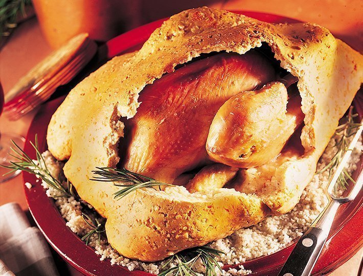 - Laissez reposer le Poulet au romarin en pâte à sel, 15 minutes hors du four avant de casser la croûte et de présenter aux convives.