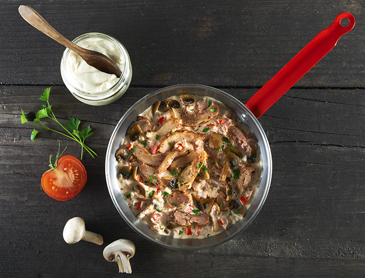 - Ajoutez les émincés de poulet rôti déjà réchauffés et servez avec des pâtes. Votre Poulet bistrot express est prêt.