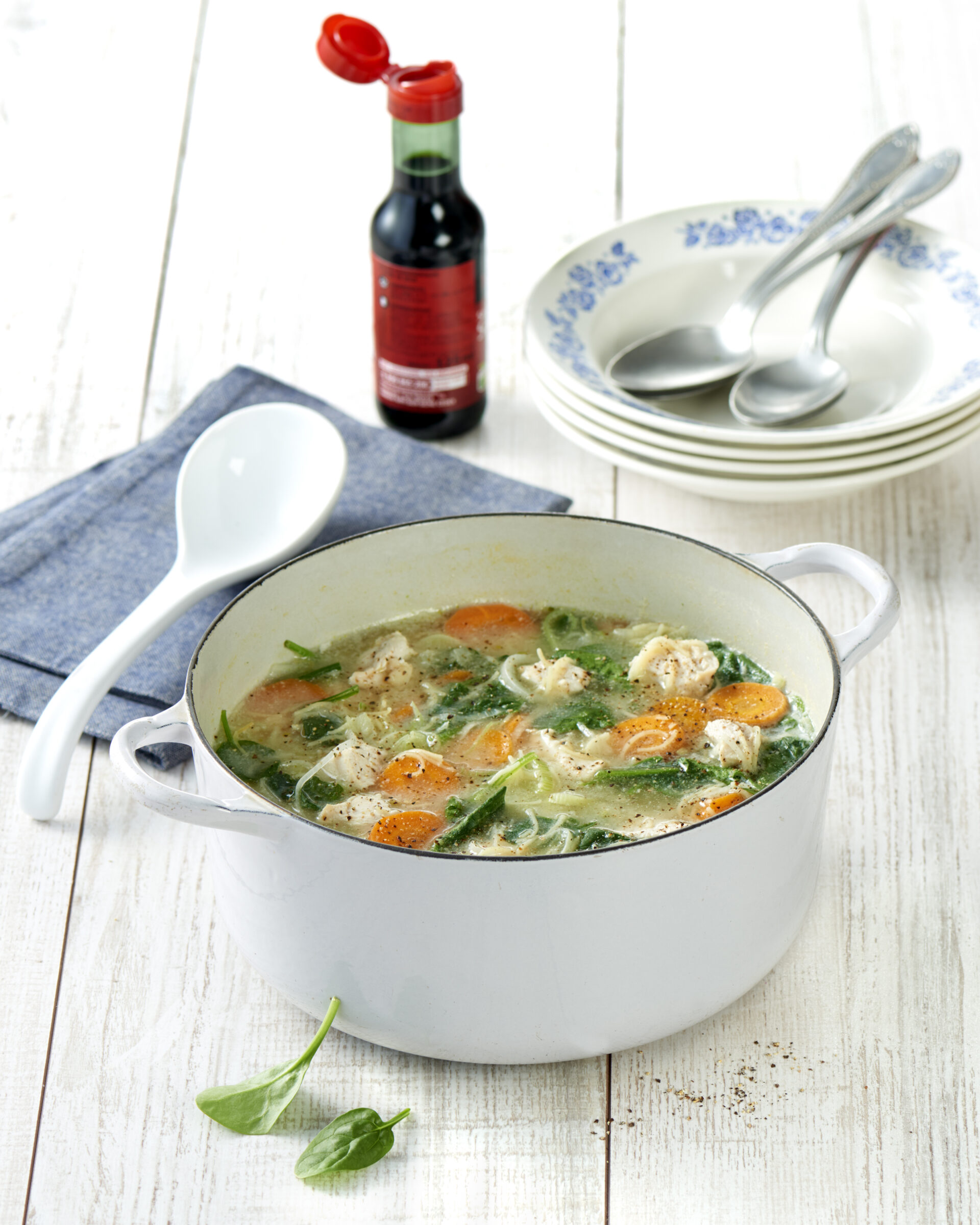 - Dans une grande cocotte, versez 1.5 litres d’eau et portez à ébullition. Ajoutez les cubes de poulet, le cube de bouillon de volaille, les pousses d’épinards, le poireau émincé, les carottes, le vermicelle, deux cuillères à soupe de sauce soja, l’oignon et une cuillère à soupe d’huile d’olive. Après la reprise d’ébullition, baissez le feu en maintenant une ébullition tout au long de la cuisson. Laissez cuire 25 minutes.