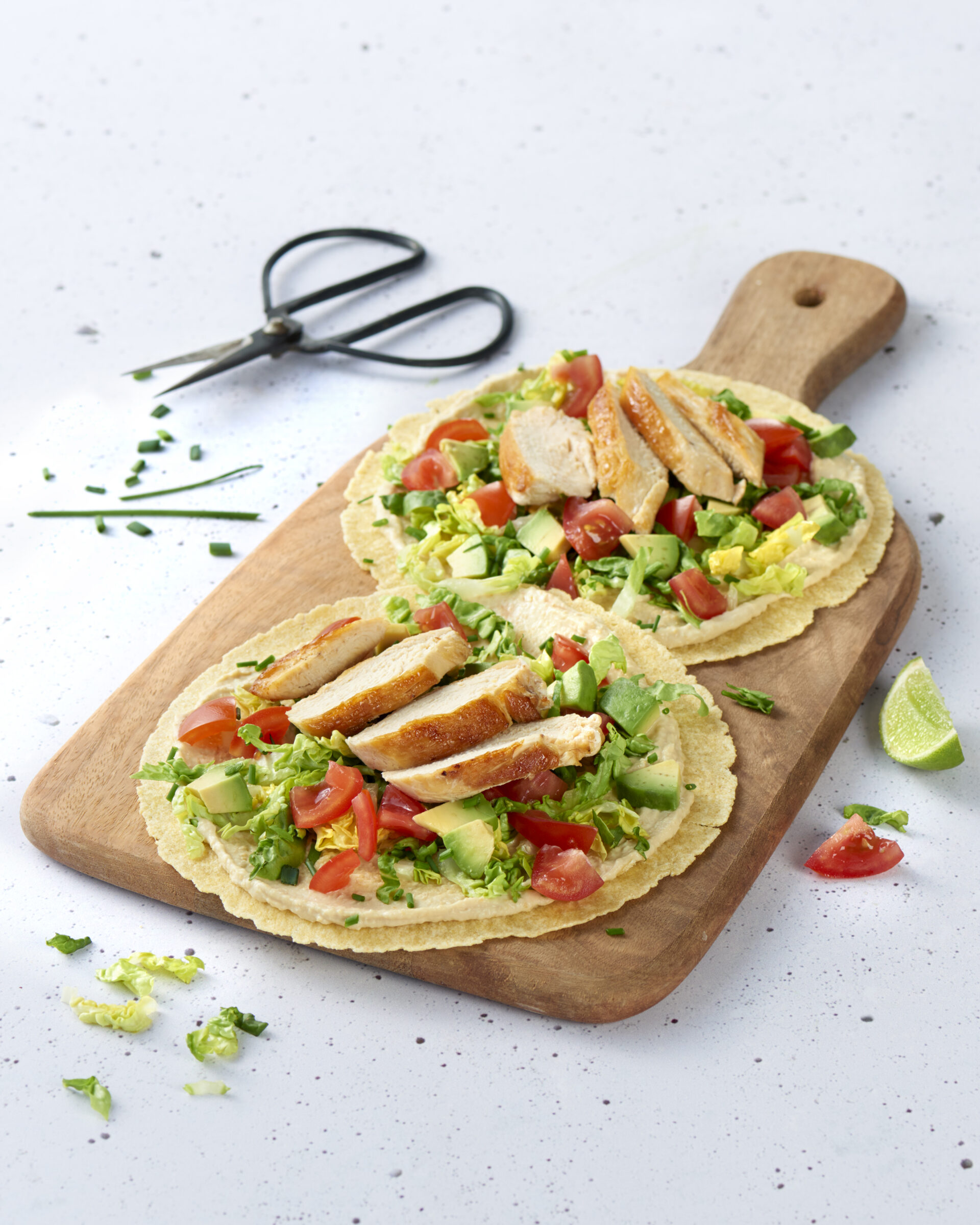 Etalez le houmous sur les tortillas et ajoutez le reste des ingrédients, saupoudrez de ciboulette, puis roulez vos tacos au poulet.